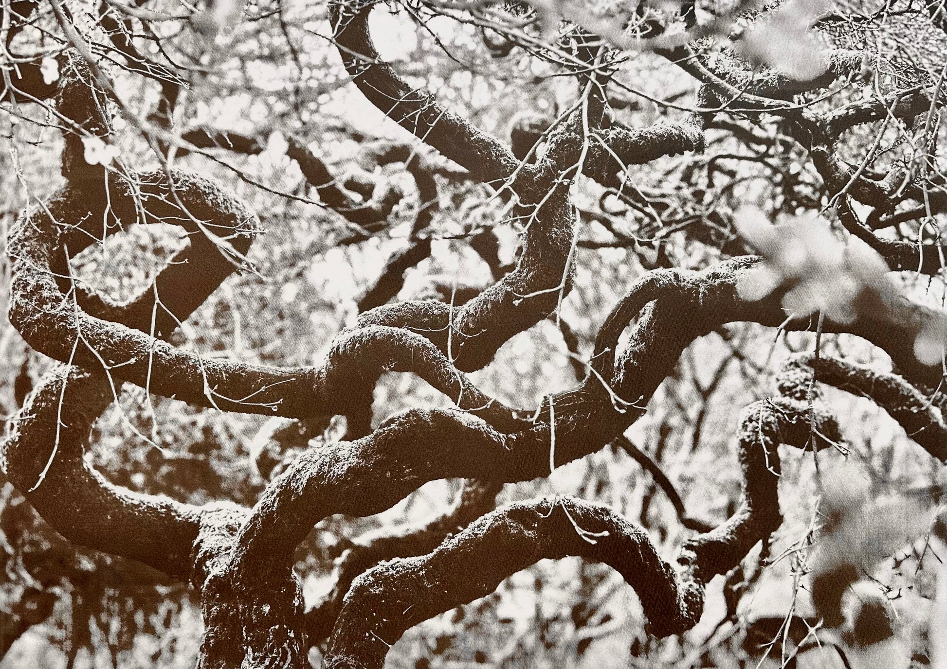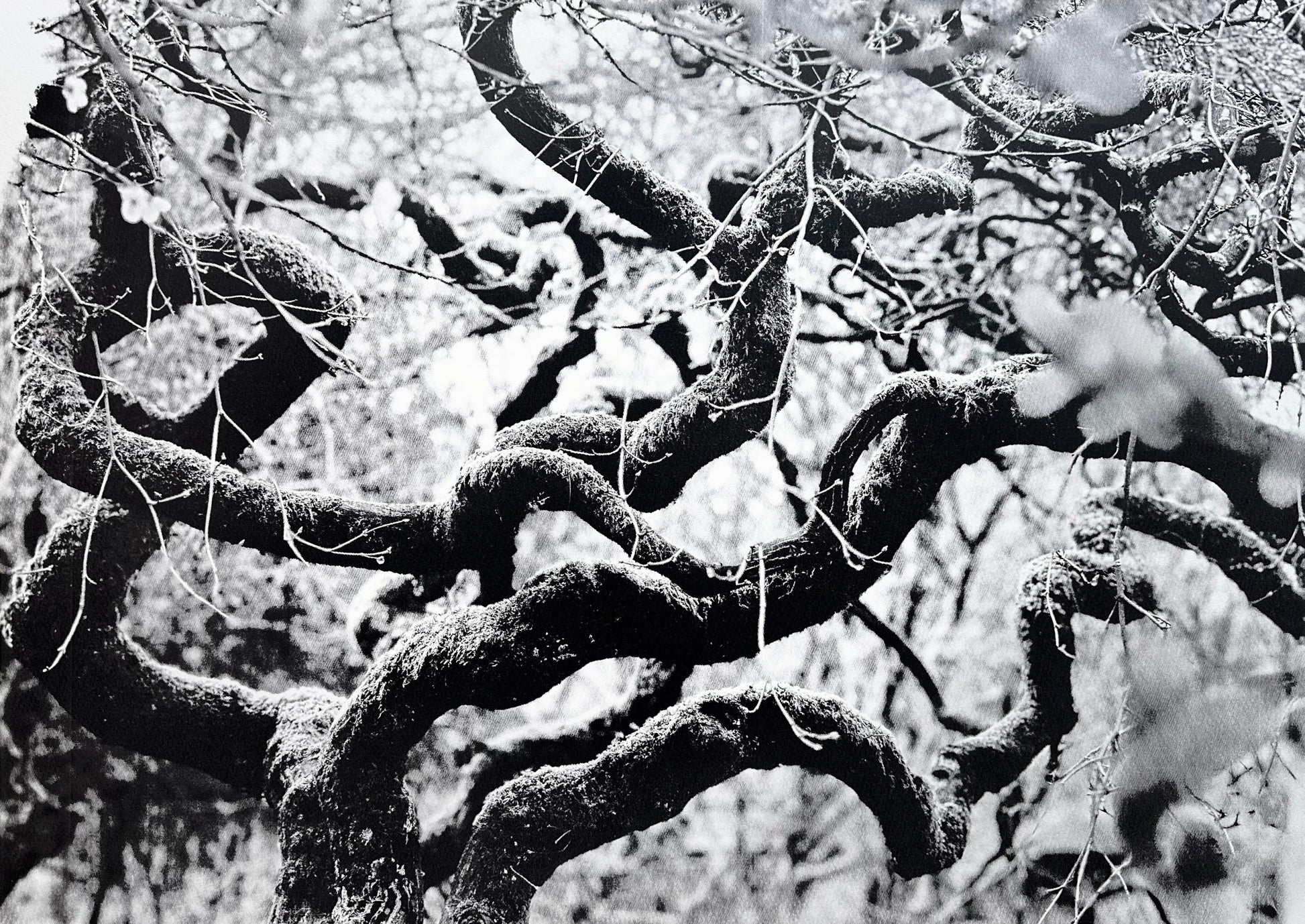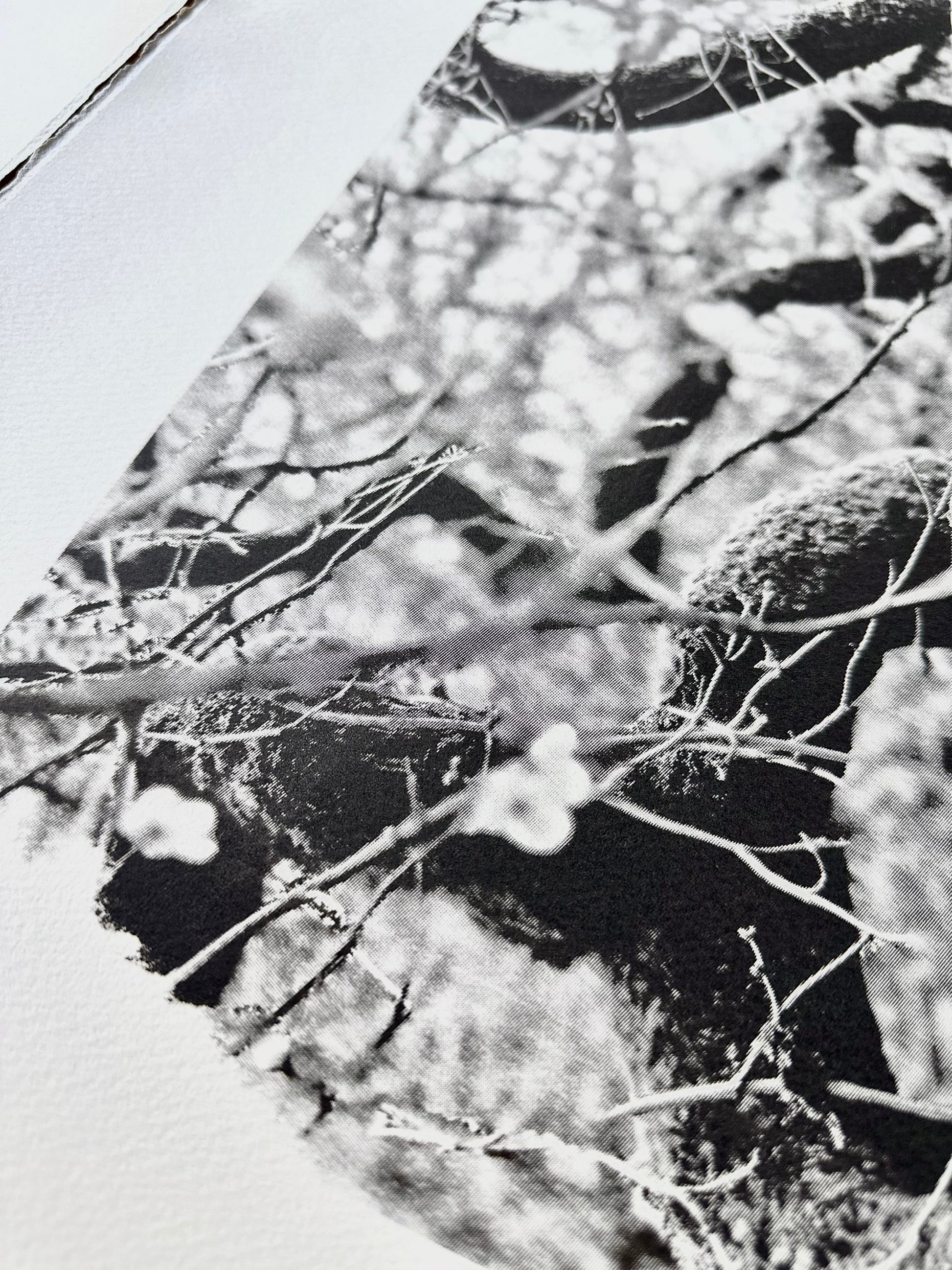 The print captures a tangle of branches — a silent geometry of life paths, twisting yet purposeful. Each curve echoes the rhythm of growth, hesitation, and return. Printed by hand using a fine halftone screen to preserve the subtle tonal shifts between shadow and light.