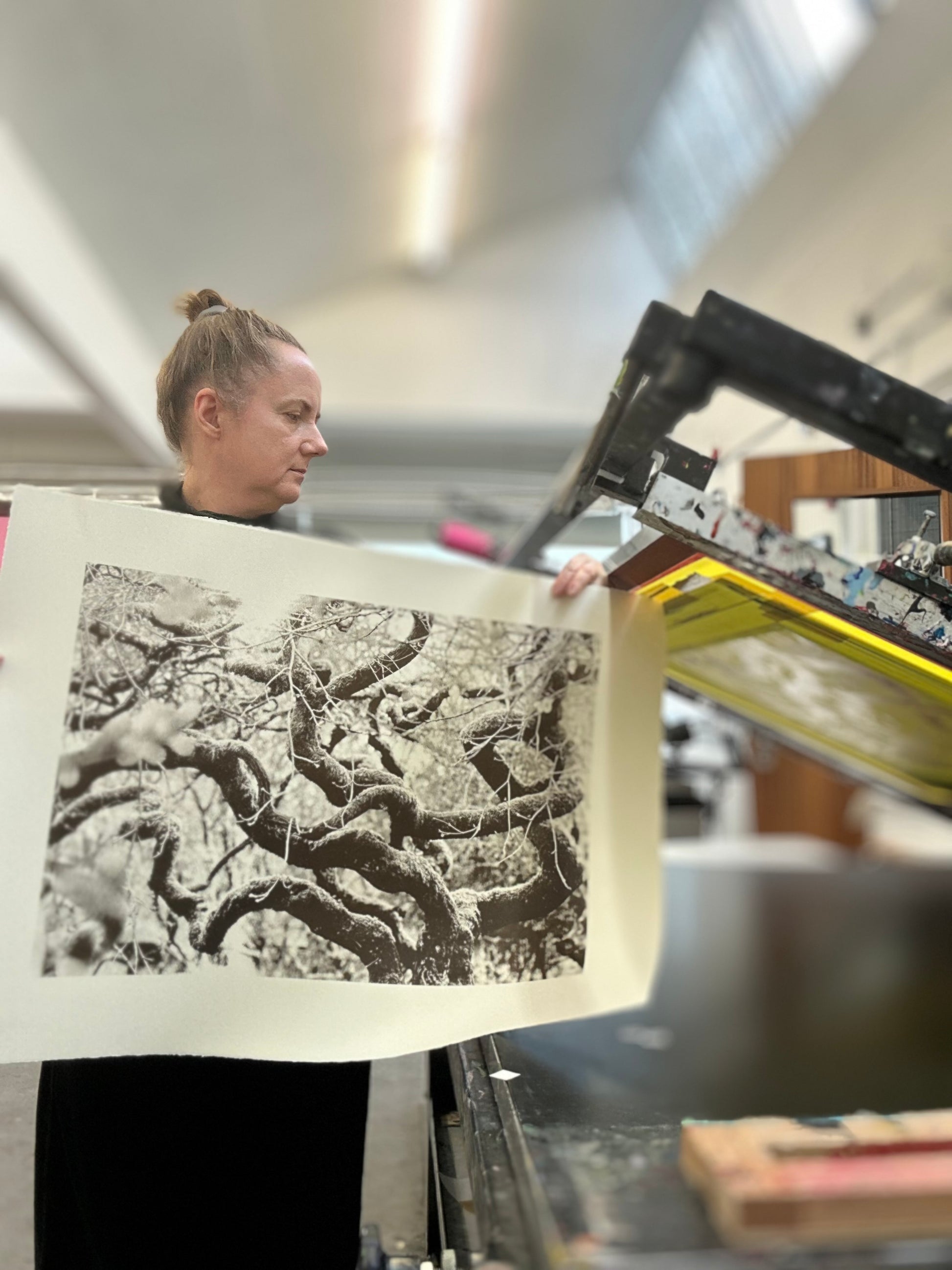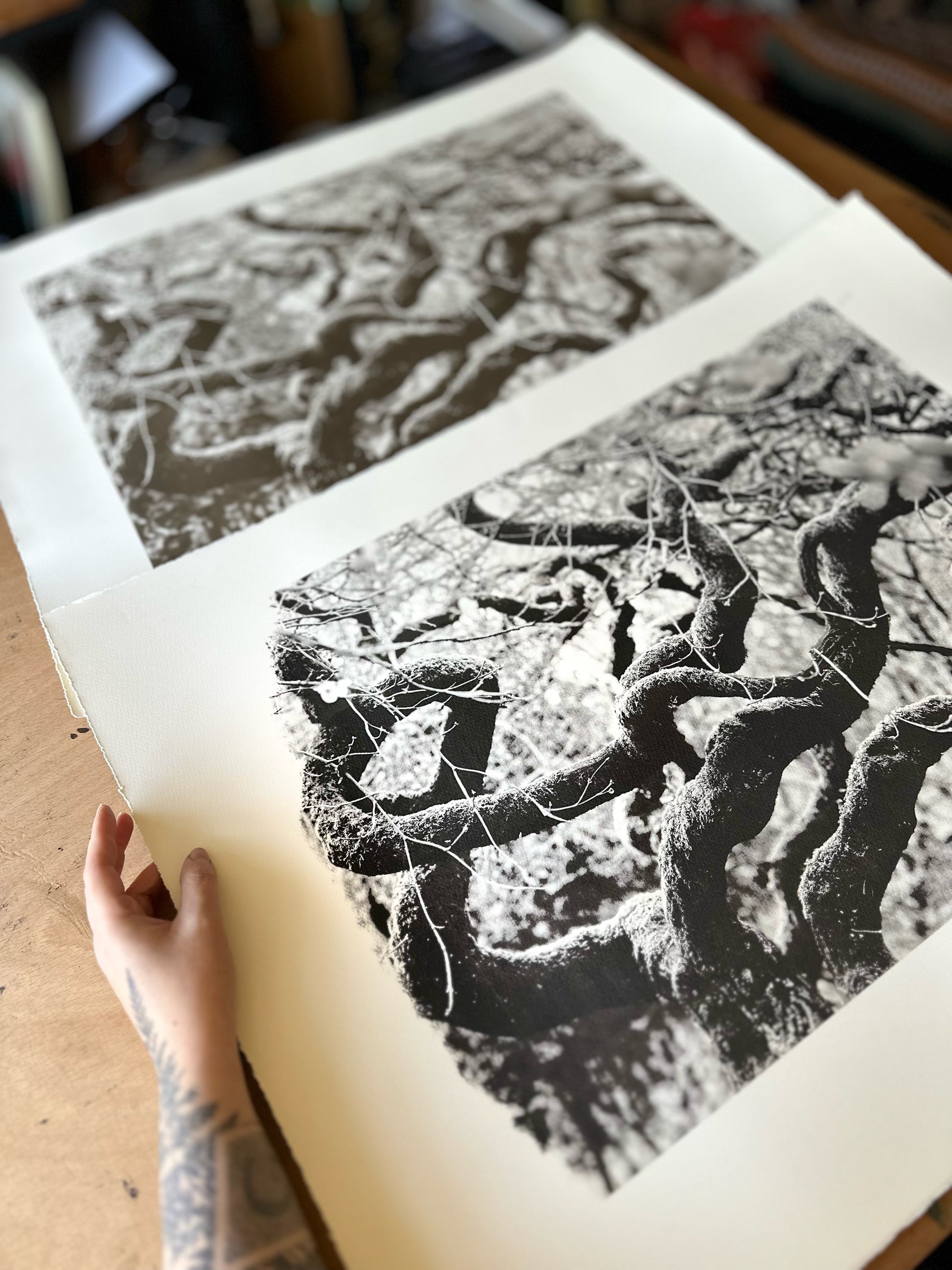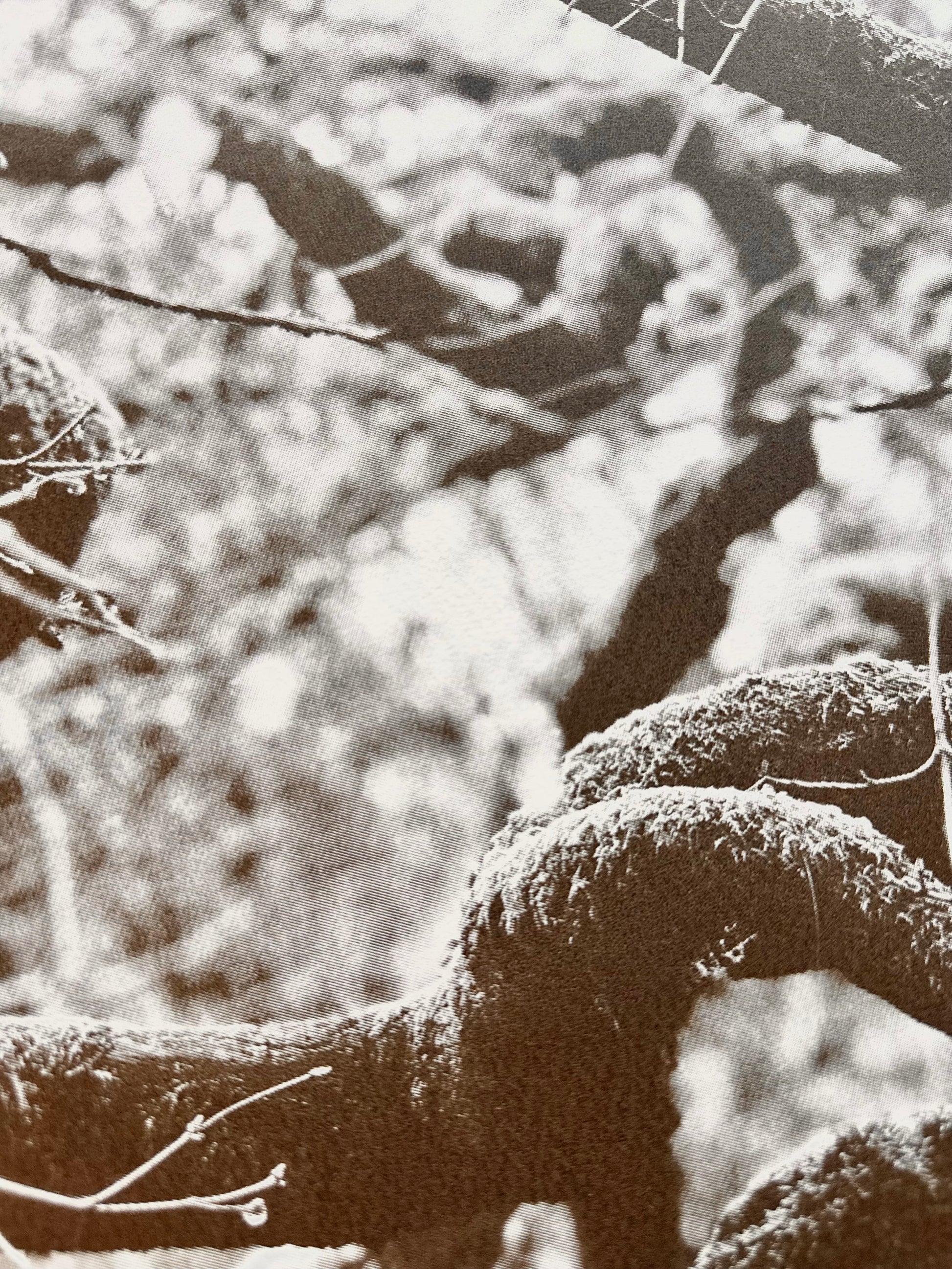 The print captures a tangle of branches — a silent geometry of life paths, twisting yet purposeful. Each curve echoes the rhythm of growth, hesitation, and return. Printed by hand using a fine halftone screen to preserve the subtle tonal shifts between shadow and light.