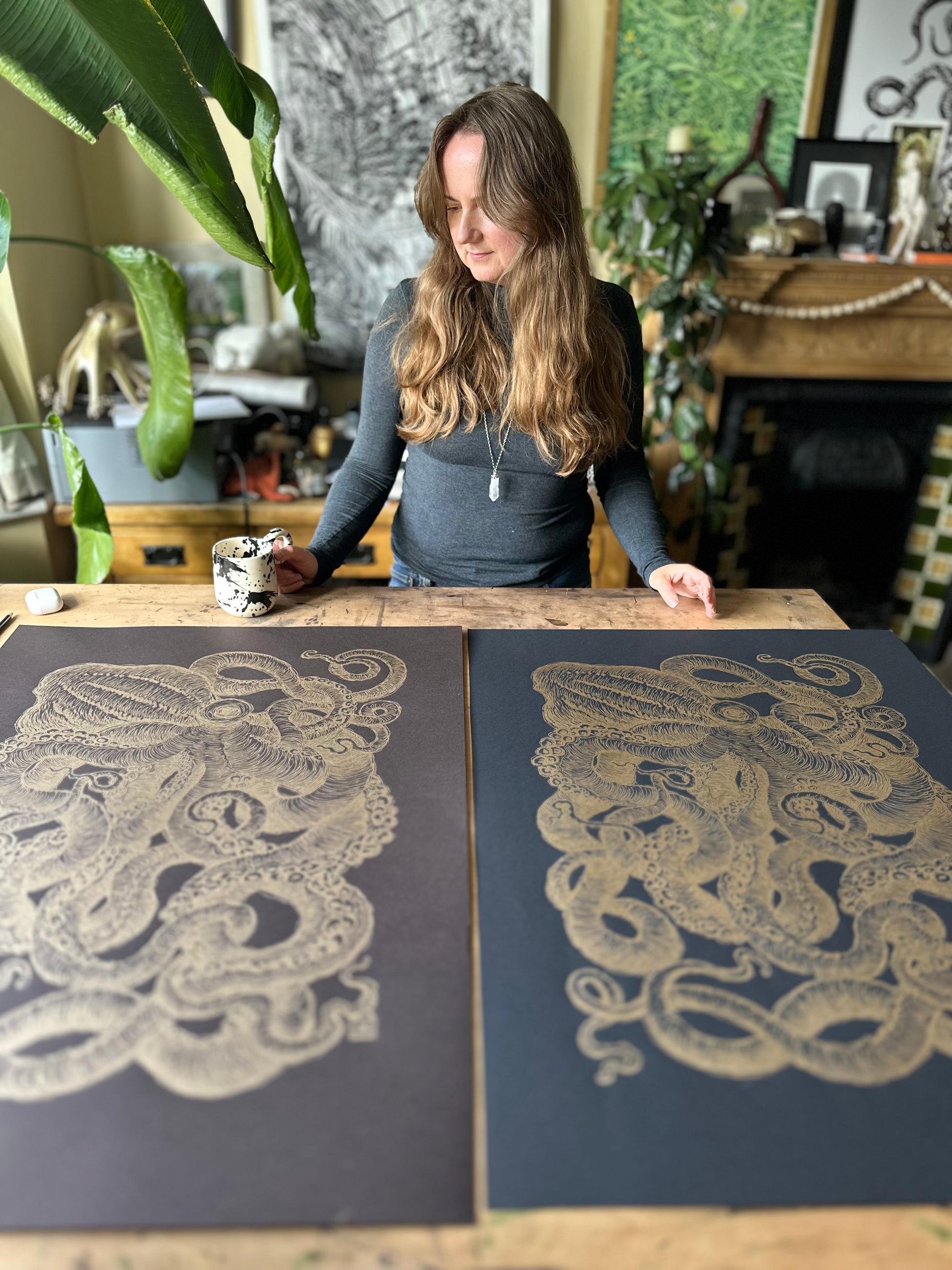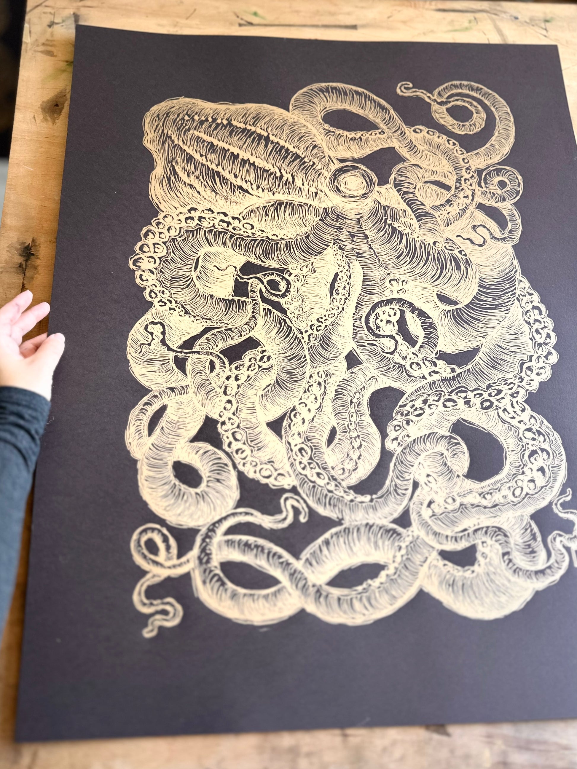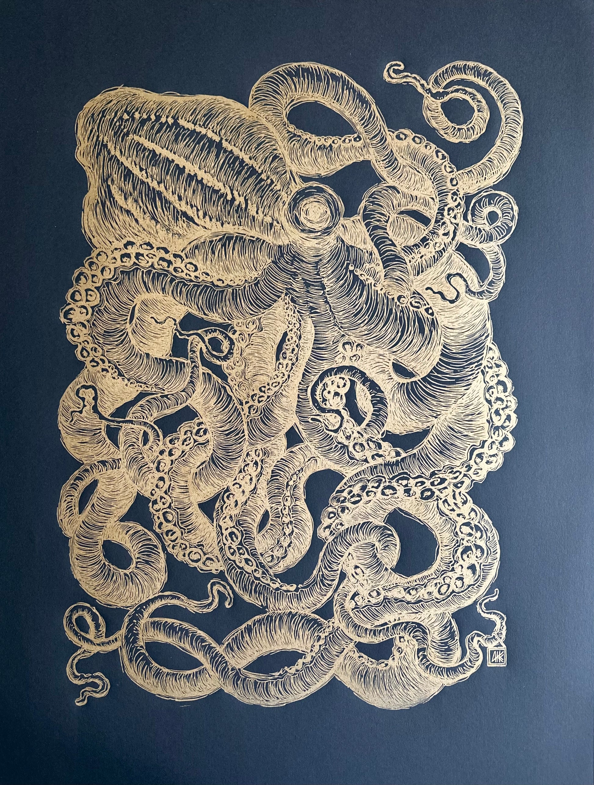 This hand-printed linocut is part of an ongoing series exploring one of my favourite subjects—intertwined octopus tentacles. The composition is filled with organic rhythm and flowing movement, offering a quiet sense of depth and complexity.