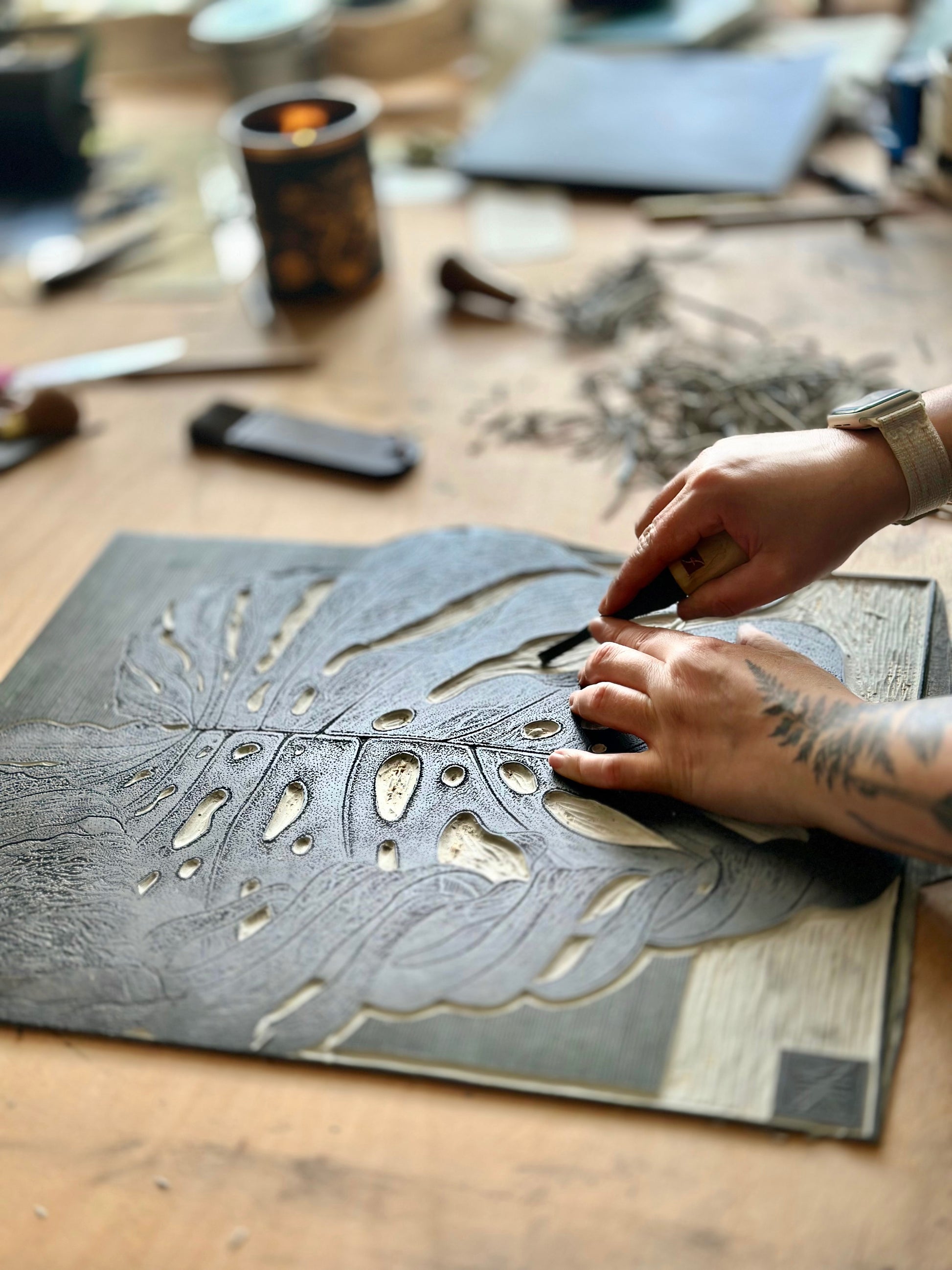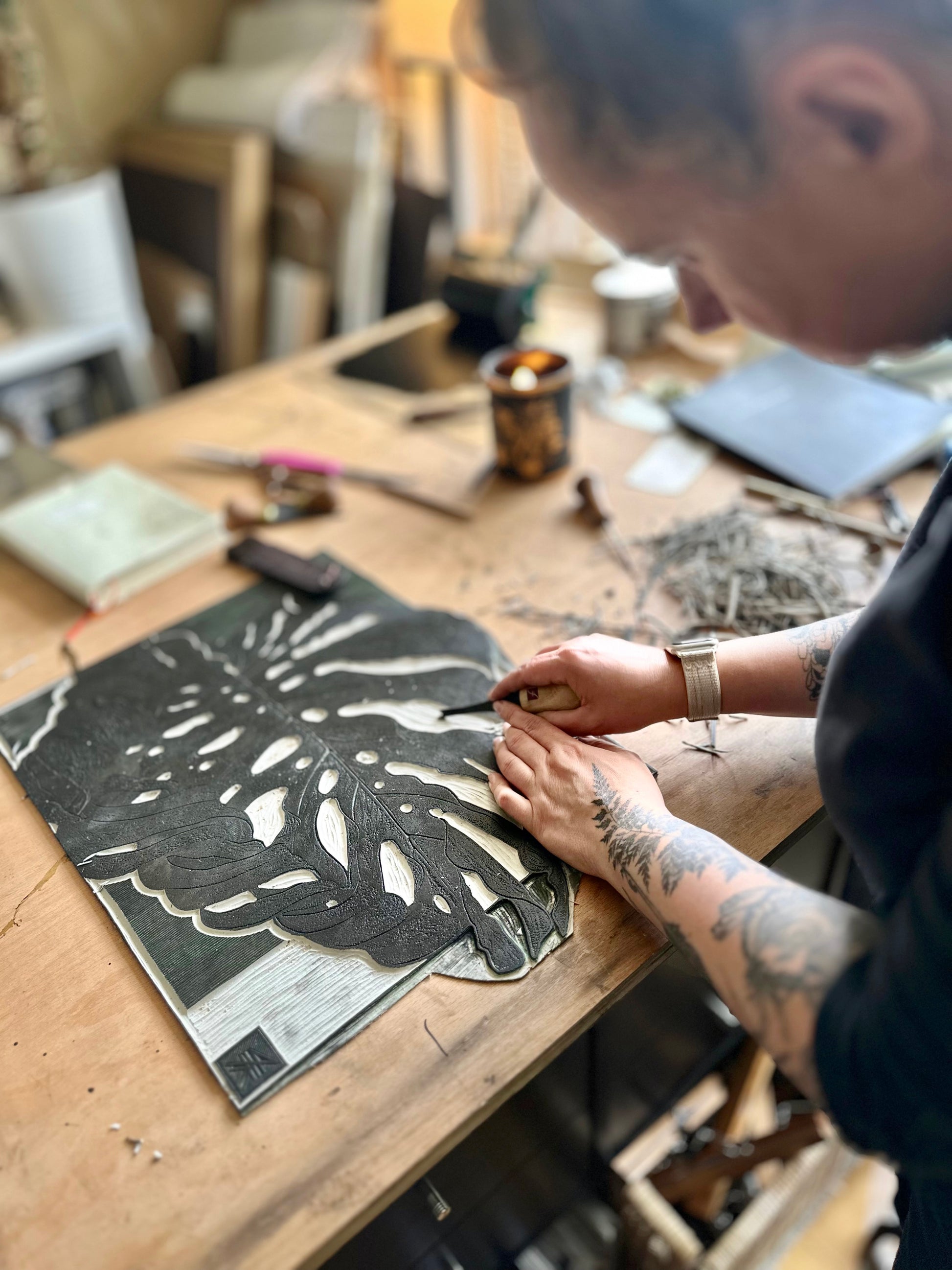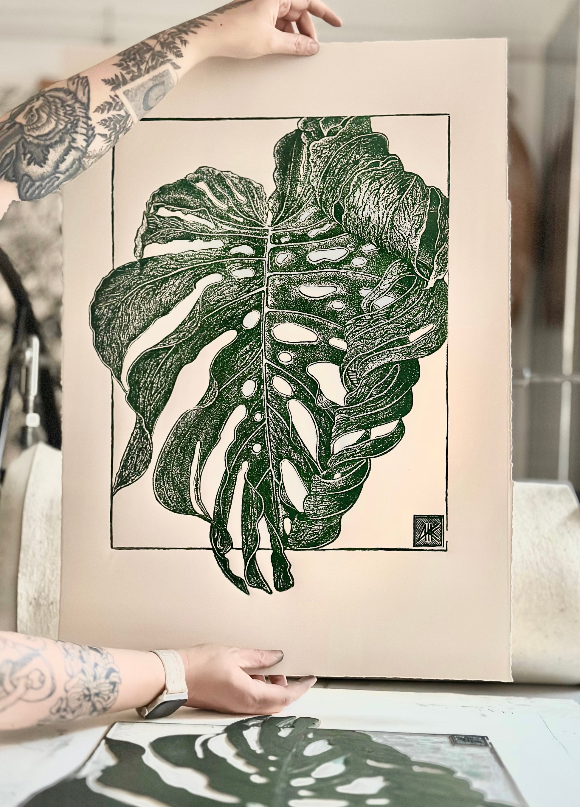 Hand printed botanical linocut print of 'Monstera's Leaf' UNFRAMED
