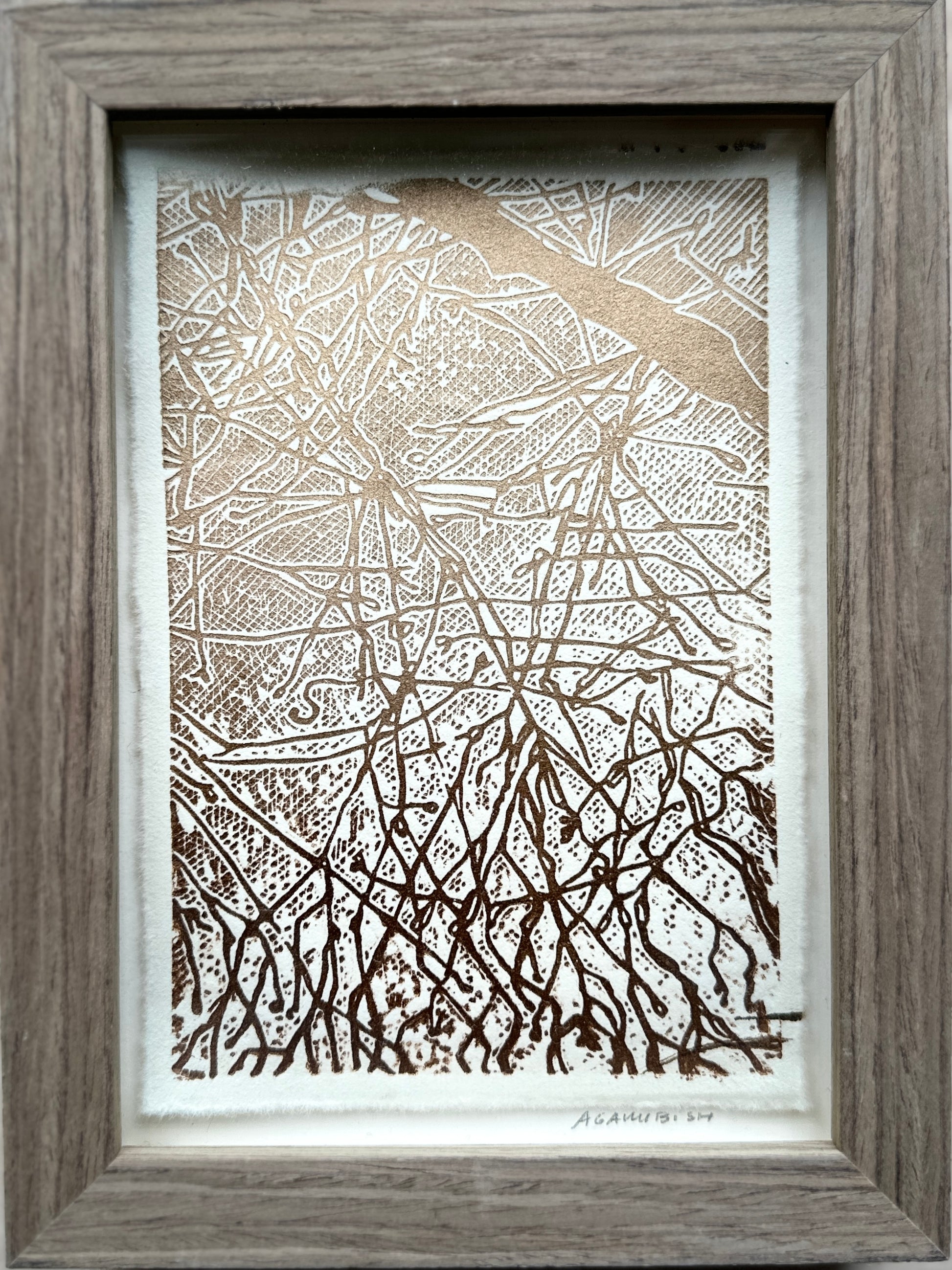 Printed in a subtle golden ink on fine Japanese paper, the piece shifts beautifully with light, revealing layers of texture and detail. Each print is hand-pulled, making every impression slightly unique.