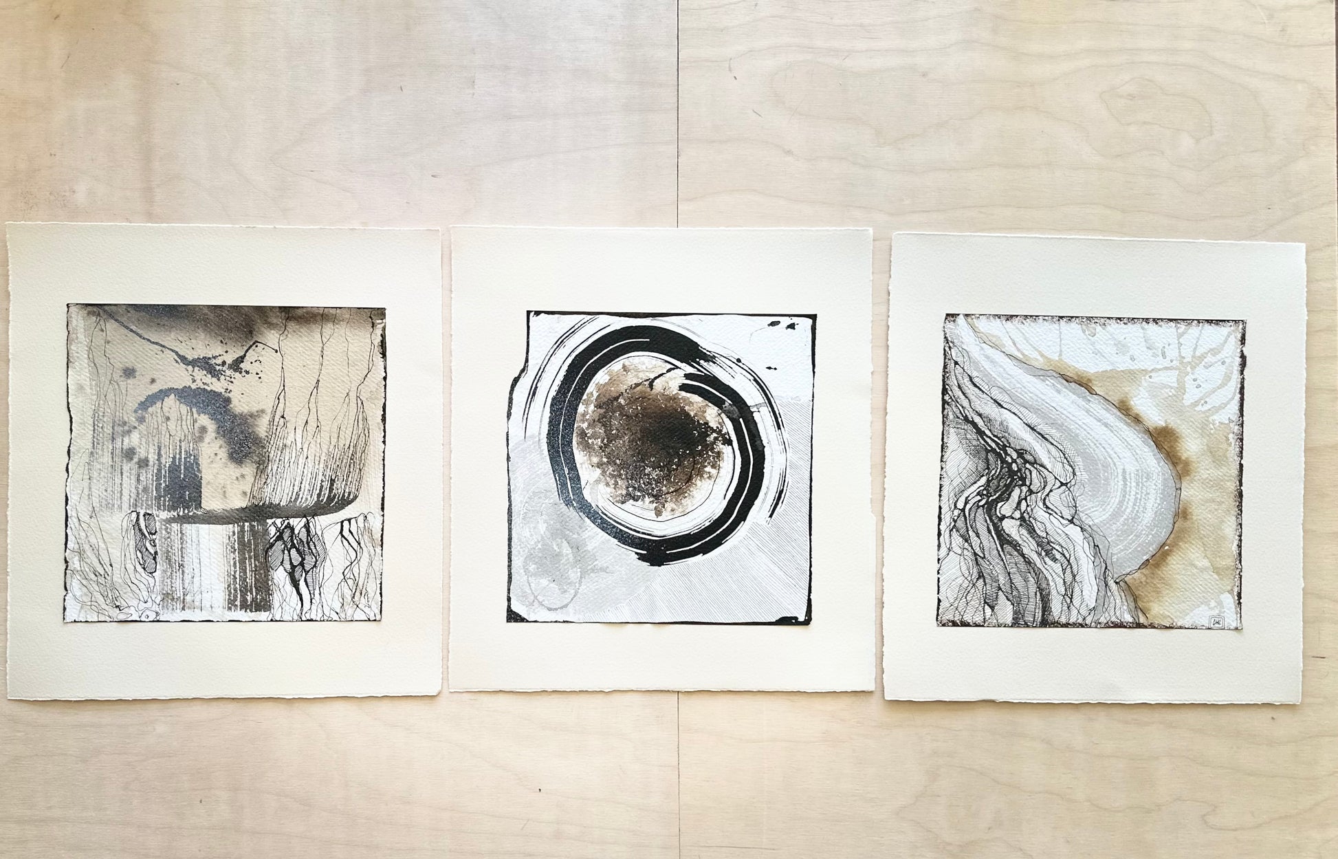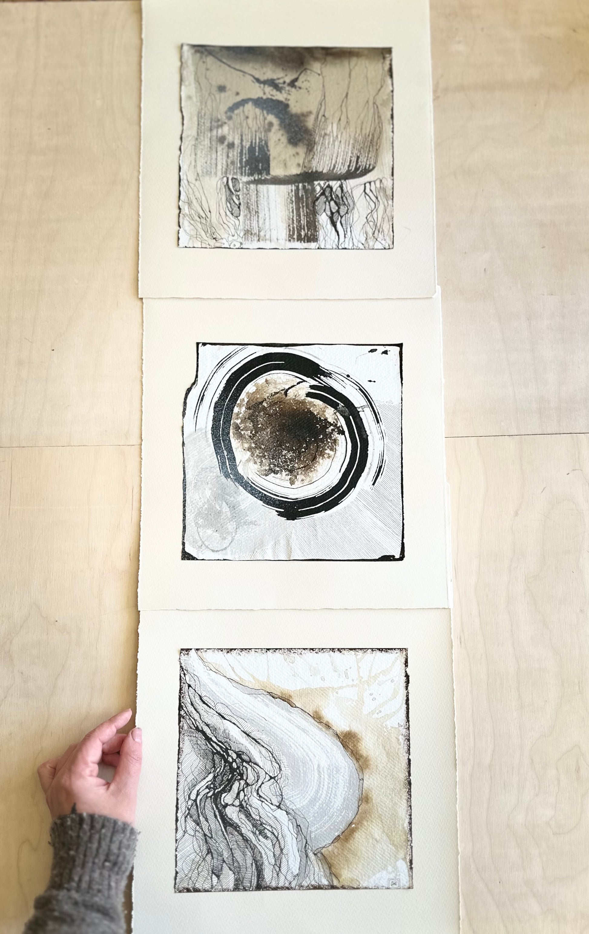 A one-of-a-kind set of three original works on paper. Each piece is hand-drawn and painted by Aga Kubish, combining fluid, organic linework with quiet, earthy washes. The artworks are created on textured Khadi cotton rag and mounted on Somerset paper, ready to frame together as a triptych or individually.