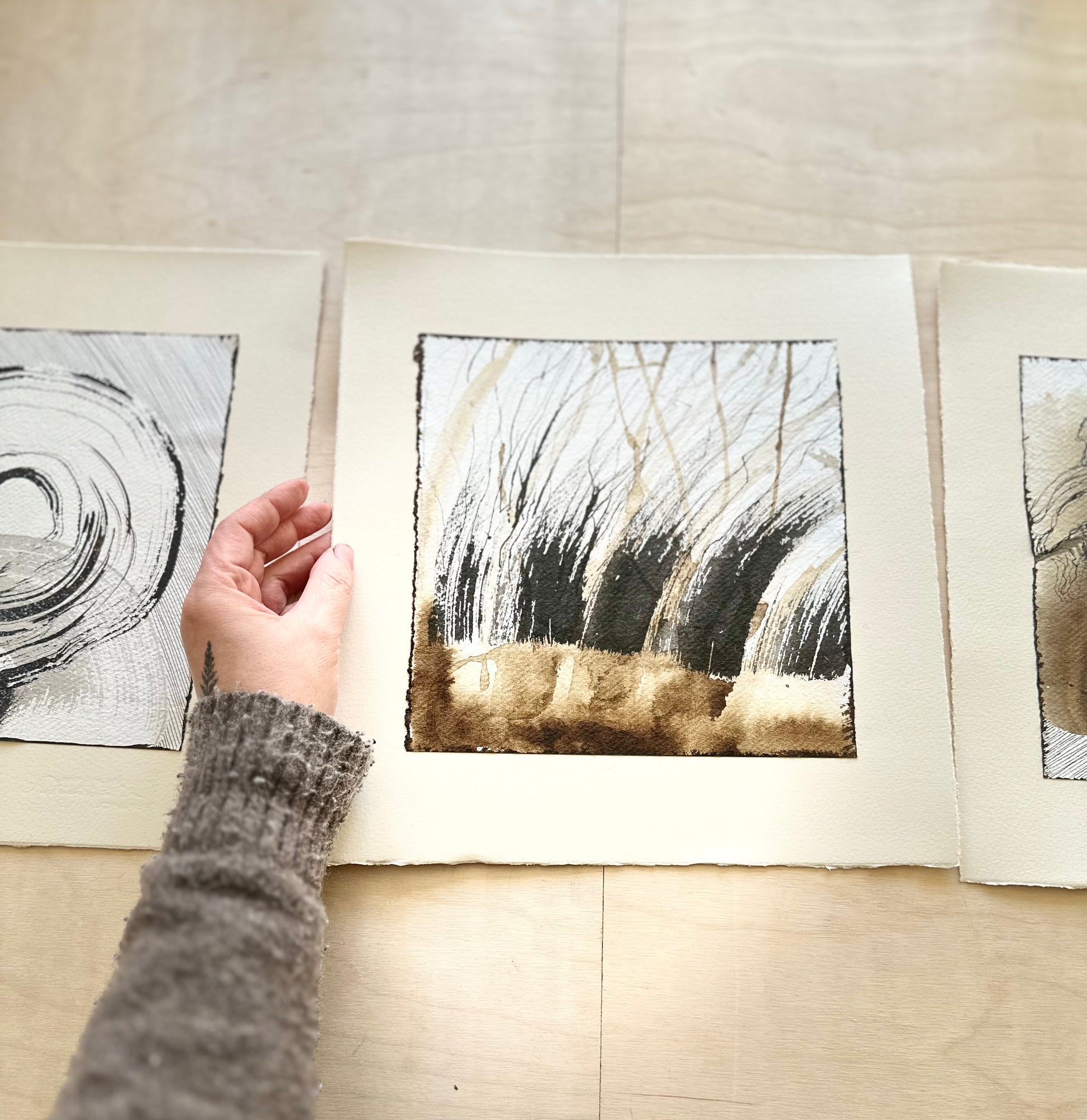 A one-of-a-kind set of three original works on paper. Each piece is hand-drawn and painted by Aga Kubish, combining fluid, organic linework with quiet, earthy washes. The artworks are created on textured Khadi cotton rag and mounted on Somerset paper, ready to frame together as a triptych or individually.