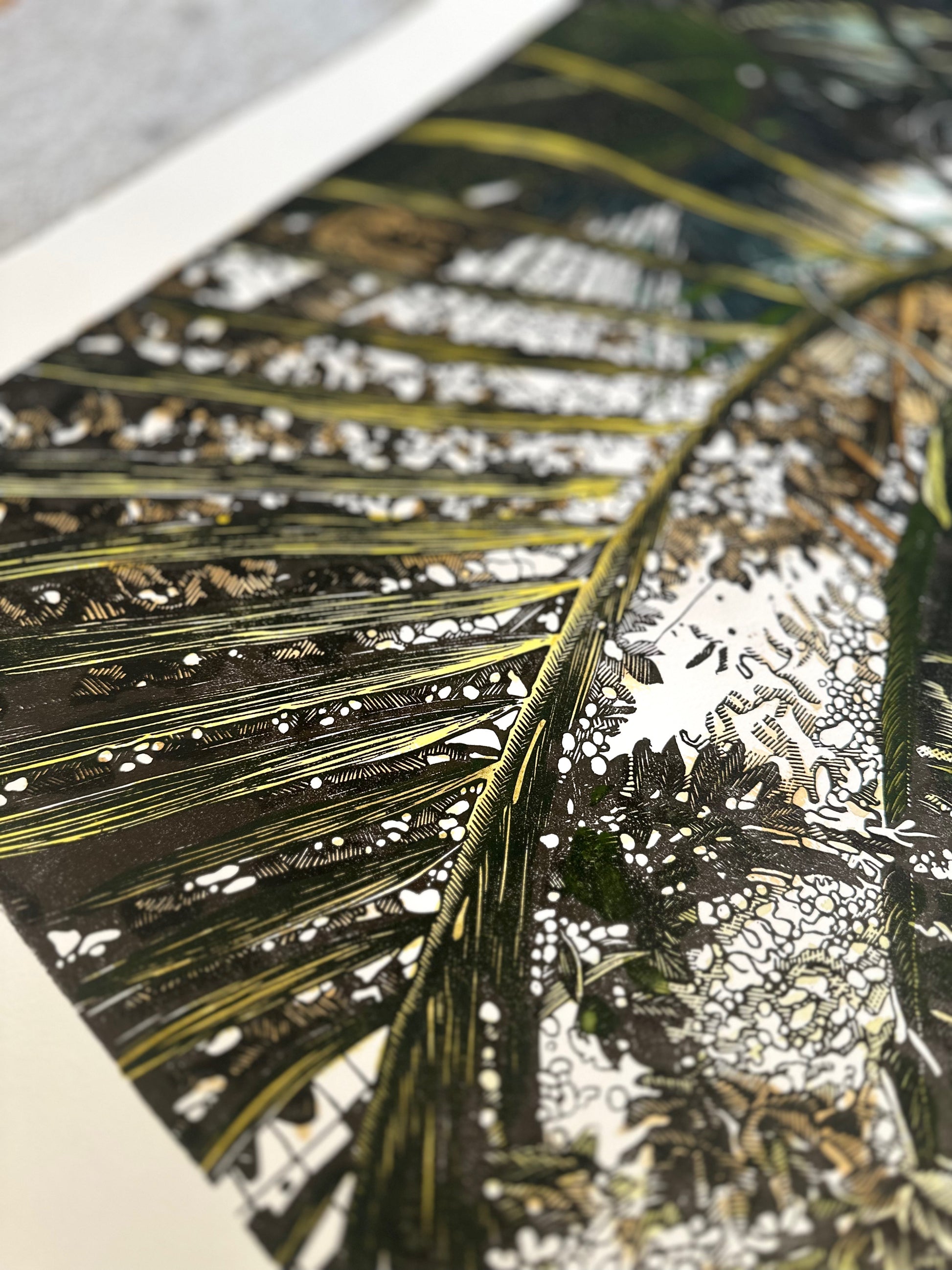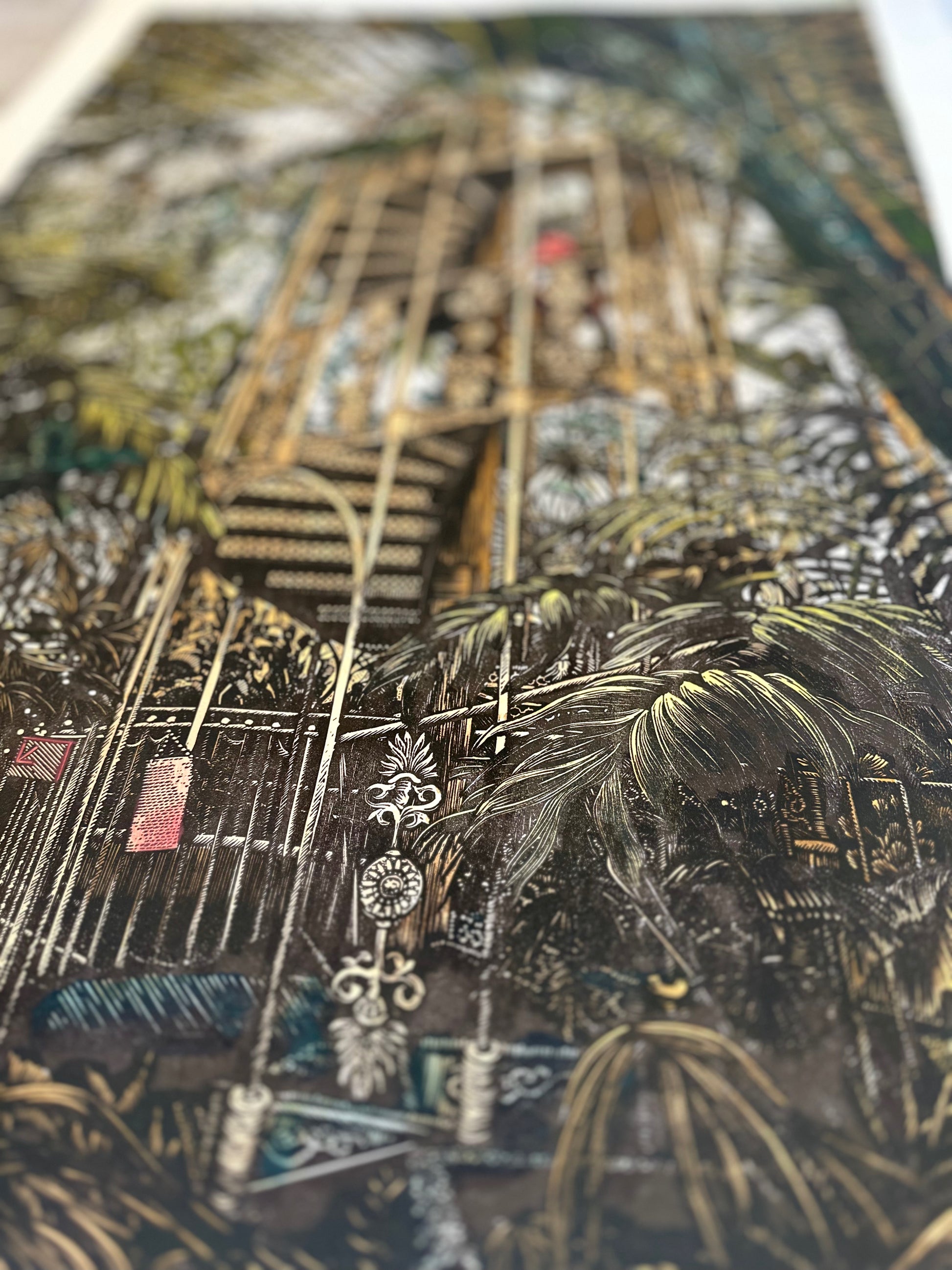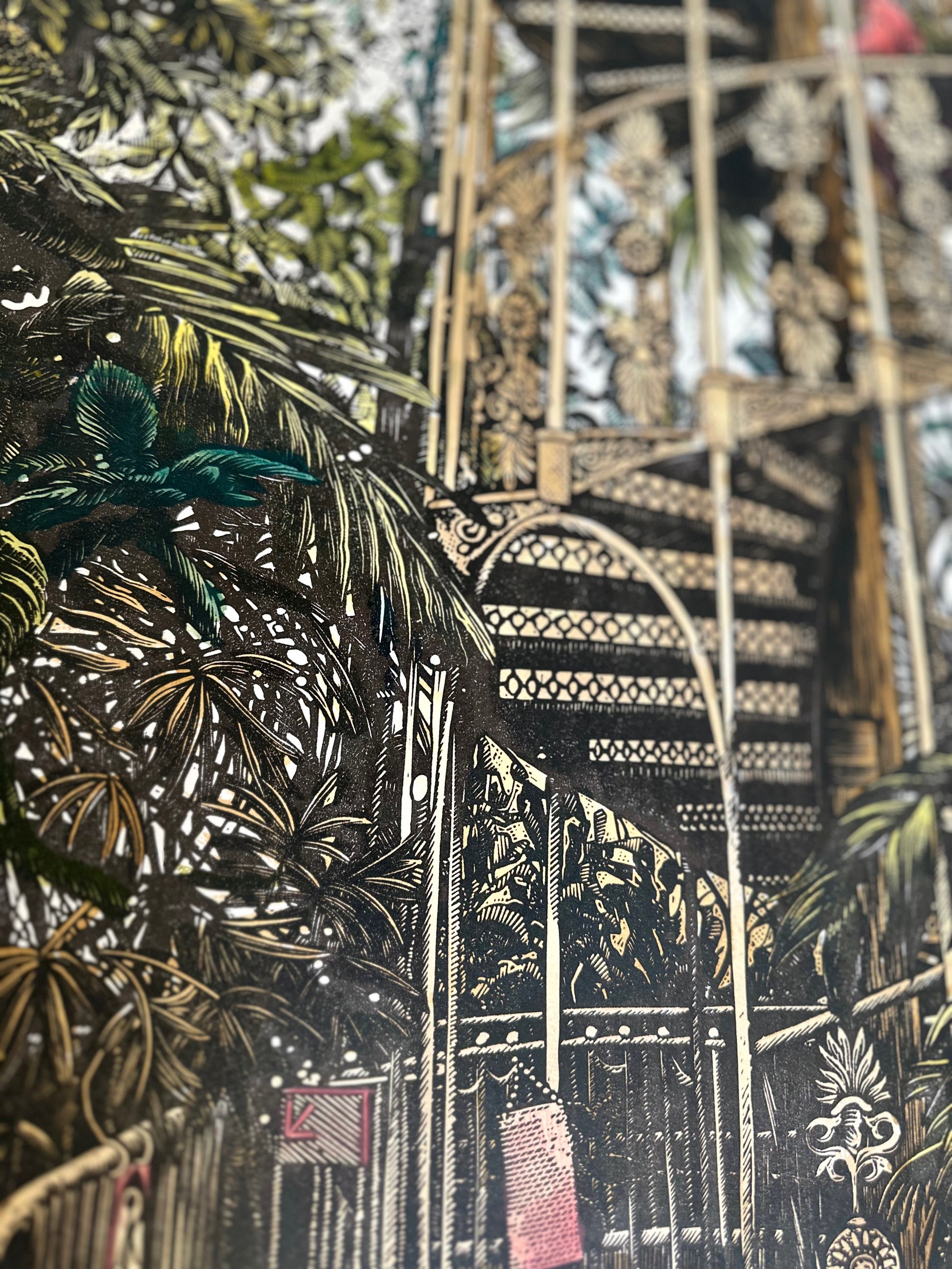 The underlying linocut was carved and printed entirely by hand, without a press, on heavyweight Somerset Velvet 220gsm paper. The additional colouring enriches the intricate textures of foliage and architectural details, drawing the viewer deeper into the vibrant interplay between nature and structure.